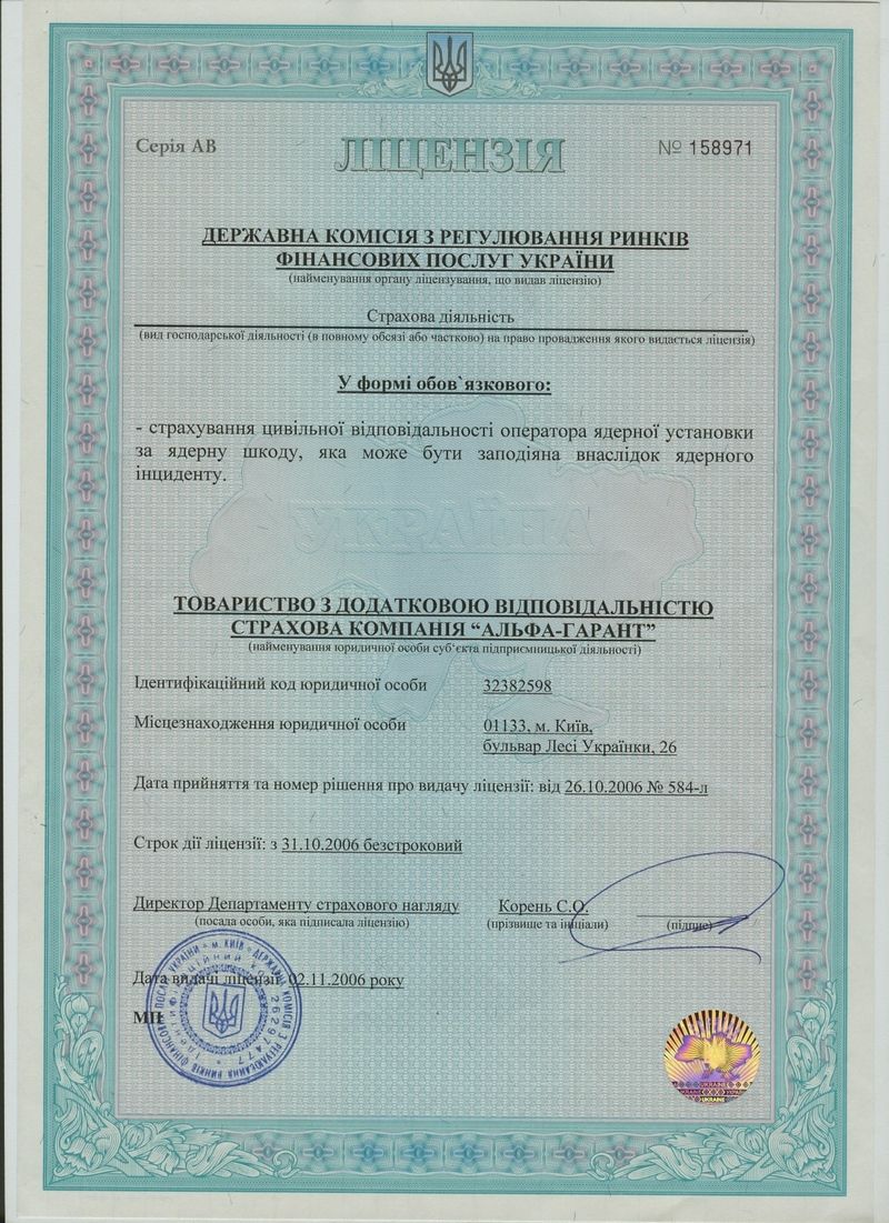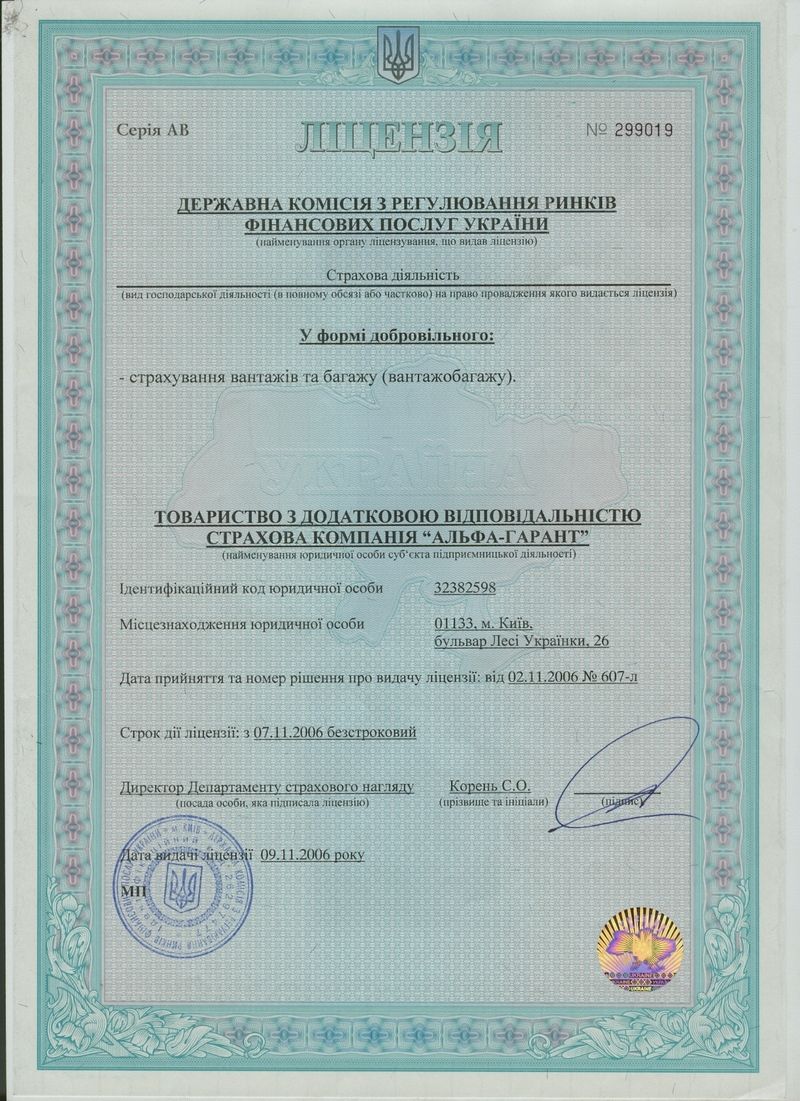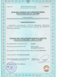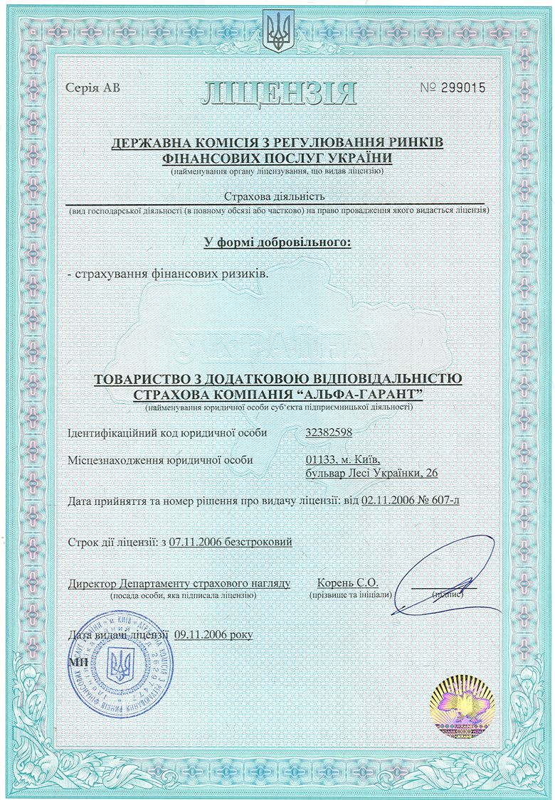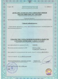 ТДВ СК "АЛЬФА-ГАРАНТ" здійснює діяльність страховика на підставі ліцензії на здійснення діяльності із страхування відповідно до класу (класів, ризиків у межах класів) страхування, інформація щодо яких міститься в Державного реєстру фінансових установ.